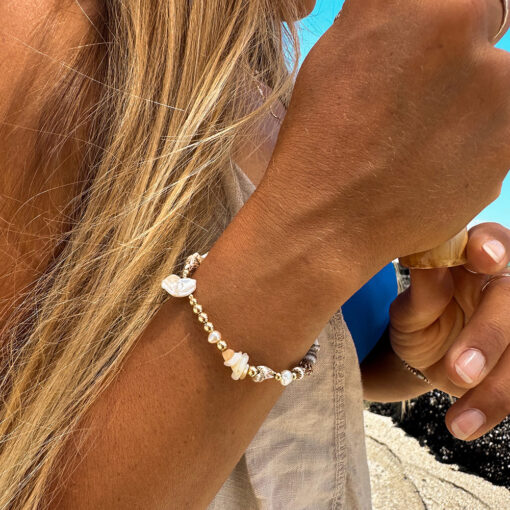 MERMAID BRACELET – A bracelet with which you will mesmerize the world around you. Our handmade design is inspired by our love of the sea and our popular Mermaid Choker necklace. It is one of our particularly unique creations, designed to reflect the grace and beauty of mermaid. The shimmering mother of pearl radiates the secrets of the depths and reminds us of the shining scales of mermaids. The variety of shells, delicate freshwater pearls, and mother of pearl embodies the beauty of the sea, allowing you to immerse yourself in a world of endless summer, turquoise waters, and paradise beaches.