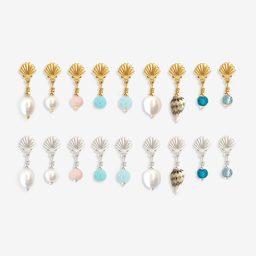 The Adrina earring combines natural elegance with maritime lightness. The shell-shaped stud rests delicately on the ear and forms the basis for the various charms that can be selected – whether shimmering freshwater pearls, small shells or special stones, every detail is inspired by the beauty of the ocean. A piece of jewelry like a day by the sea – light, radiant and full of life. We lovingly handcraft your favorite ANDRINA variant for you. The different charms always match certain necklaces and bracelets from us.