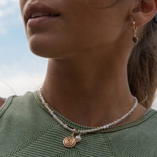 “Kaimana” means ‘the power of the ocean’ in Hawaiian – and that is exactly what this necklace is designed to embody. Natural shaped freshwater pearls shimmer around your neck, while the delicately wrapped spiral pendant gives the necklace a unique highlight. The choker combines strength and softness and is a real eye-catcher with any outfit. It is enchanting on its own but also looks great in combination with our other necklaces.