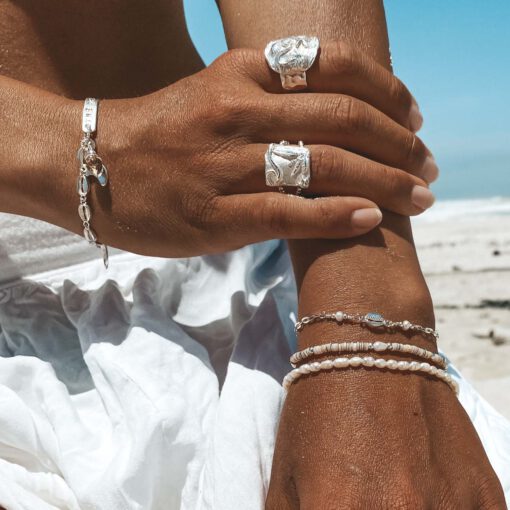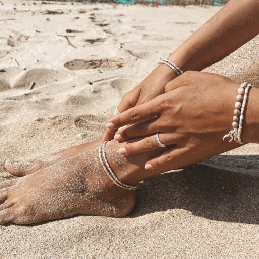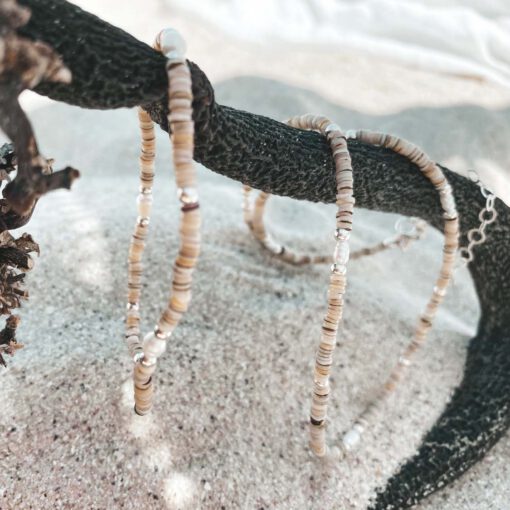 Sandy – Du läufst barfuss über den Strand…bei jedem Schritt sinkst du leicht in den warmen Sand ein, der sanft deinen Fuß umschließt. Du kniest dich hin, fühlst den Sand mit deinen Händen und lässt ihn langsam durch deine Finger rieseln. Das Muschelmaterial, aus dem wir dieses Armkettchen anfertigen, kombiniert verschiedene Naturtöne – ist es hell beige, weiß oder doch leicht grau?