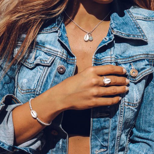 YUMA, die kleine Kauri-Königin, gefasst und beschüzt in einem silbernen Korsett, besticht durch ihre schlichte Eleganz. Die faszinierende Kauri geht fließend über in den Rhythmus der kleinen Silberkugeln.