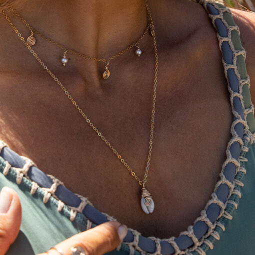 Jede kleine handgeformte Spiralen ist ein Symbol für die Liebe zu dir selbst. Die kleinen Süßwasserperlen setzen sanfte schimmernde Lichtpunkte – die die Kette strahlen lassen. Ein filigranes Kettendesign, das durch seine Einzigartigkeit auffällt.