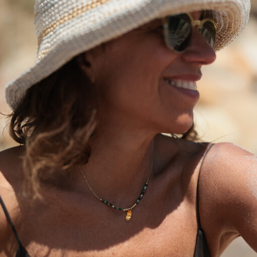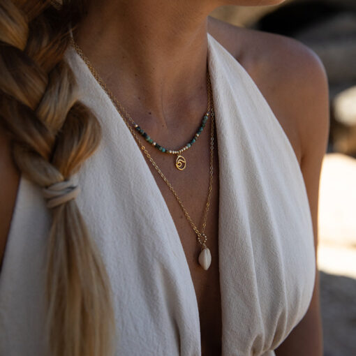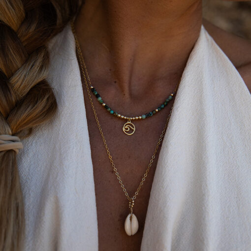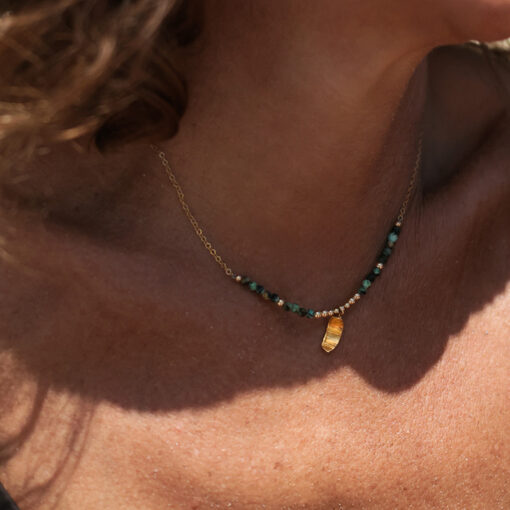 Die Talumea Halskette verbindet die Kraft der Natur mit zeitloser Eleganz. Kleine facettierte Afrikanische Türkis Steine in Grün-, Blau- und Erdtönen kreieren ein einzigartiges Wechselspiel von Farben – durchsetzt mit kleinen Bubbles Perlen als Akzente, die Licht und Wärme reflektieren.